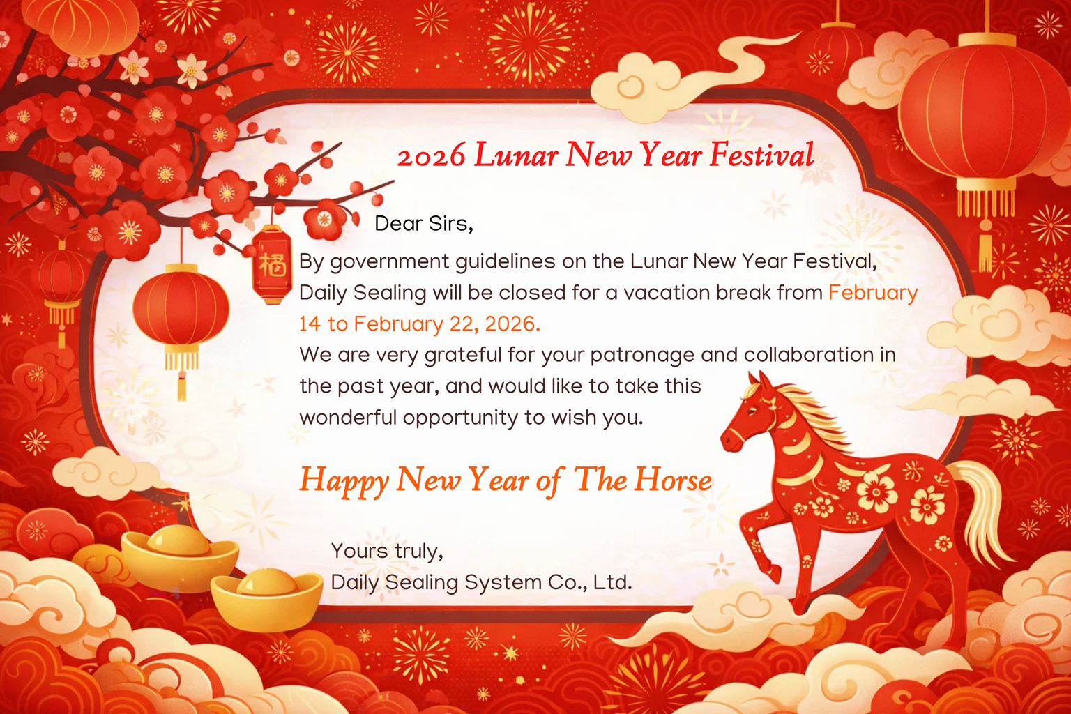 By government guidelines on the Lunar New Year Festival, Daily Sealing will be closed for a vacation break from February 14 to February 22, 2026.